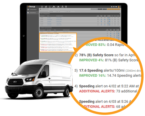 - Driver Coaching Dashboard highlighting safety trends and insights.